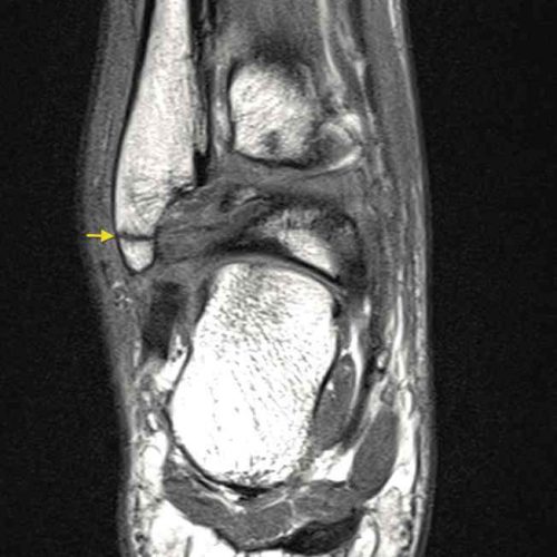 Imagem de ressonância magnética (Cor T1) com identificação de fratura transversa do maléololateral da fíbula com desvio mínimo.