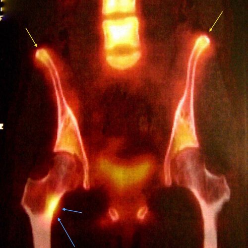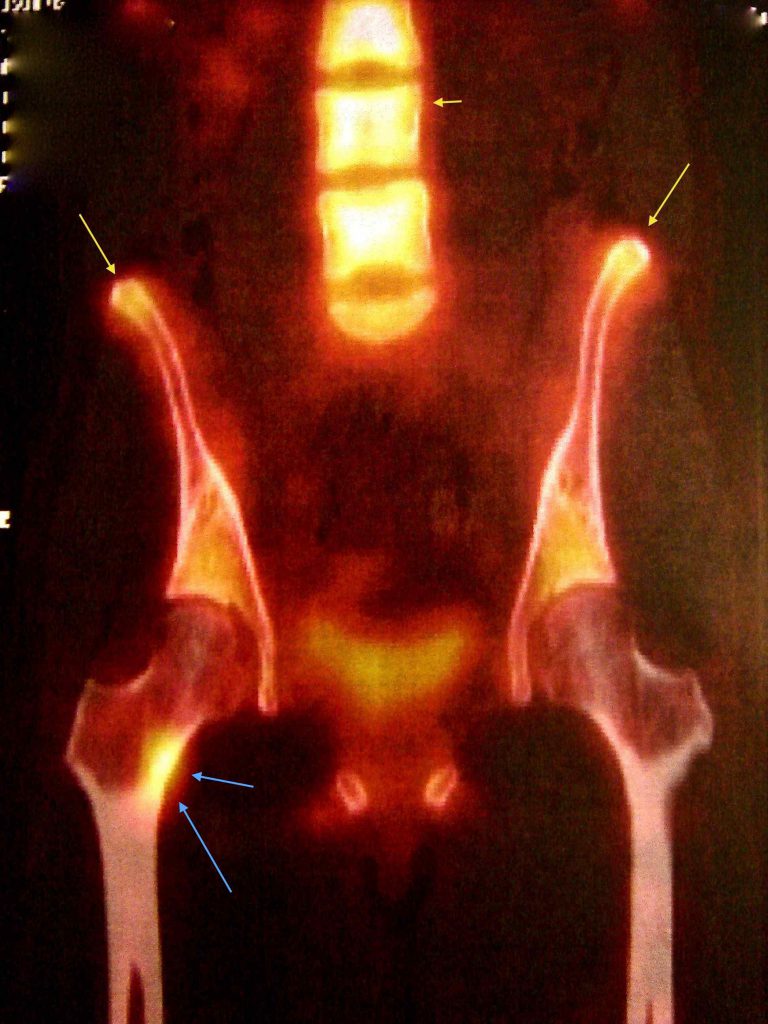Imagem tomográfica associada a cintilografia óssea com identificação de zona de concentração do radiotraçador no cortex inferior do colo do fêmur (setas azuis) e zonas normais de aumento de concentração do radiotraçador identificadas por setas amarelas (cristas iliacas, vértebras).